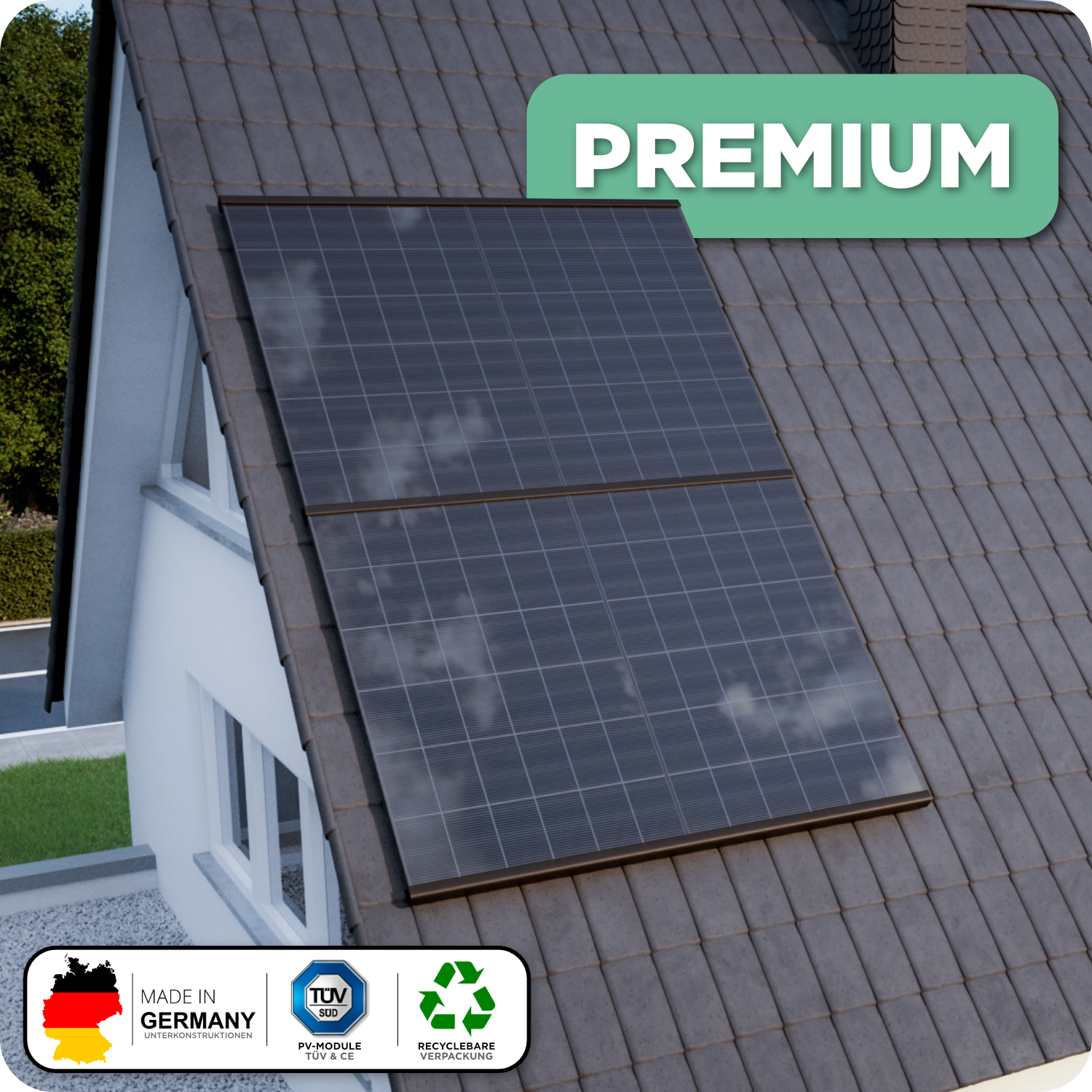 - Elegantes Design: Das SOL50 System integriert Ihr Solarmodul nahtlos in das Ziegeldach, sodass die Anlage nicht wie ein Fremdkörper wirkt. Das einheitliche Modulfeld sorgt für eine ansprechende und moderne Optik, in einem matten schwarz.