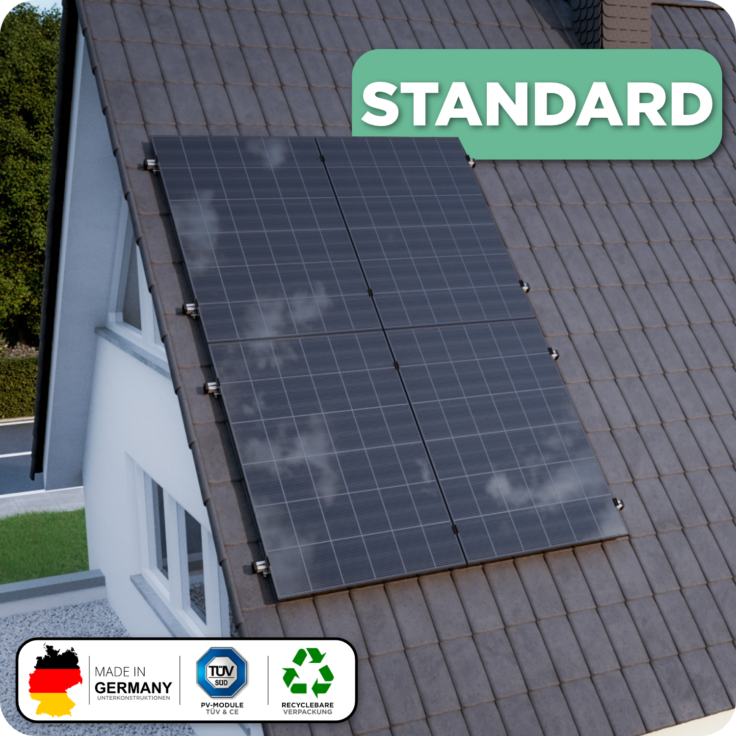 Unser Standard-Montagesystem bietet eine bewährte und kosteneffiziente Möglichkeit, Ihr Balkonkraftwerk sicher und stabil auf einem Ziegeldach zu montieren.